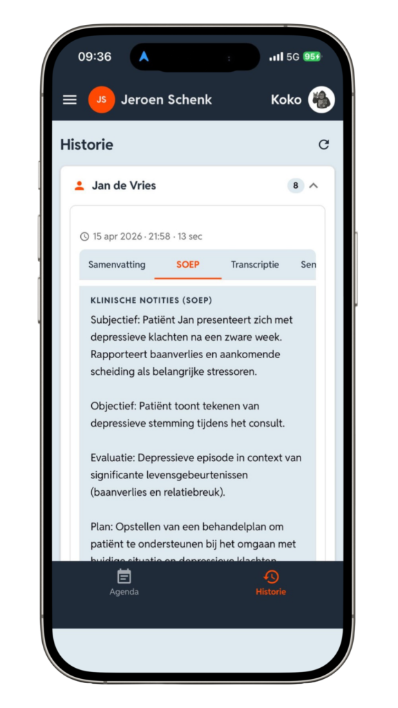 Voor veel behandelaren zit de meeste tijd niet in het gesprek, maar in het omzetten van dat gesprek naar een bruikbaar, gestructureerd verslag. Koko Voice ondersteunt dat proces met een automatische SOEP-uitwerking, zodat de eerste opzet al voor je klaarstaat.