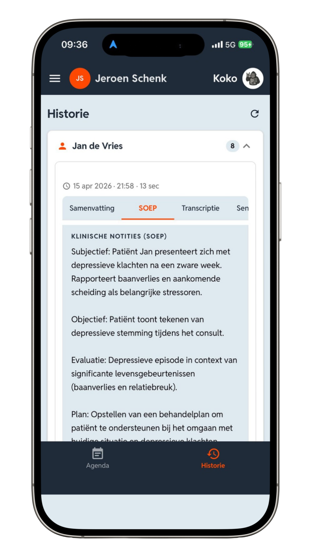 Na de opname verwerkt Koko Voice het gesprek automatisch. Je krijgt direct een transcriptie, samenvatting, SOEP-uitwerking, sentimentsanalyse en risicosignalen als dat nodig is.