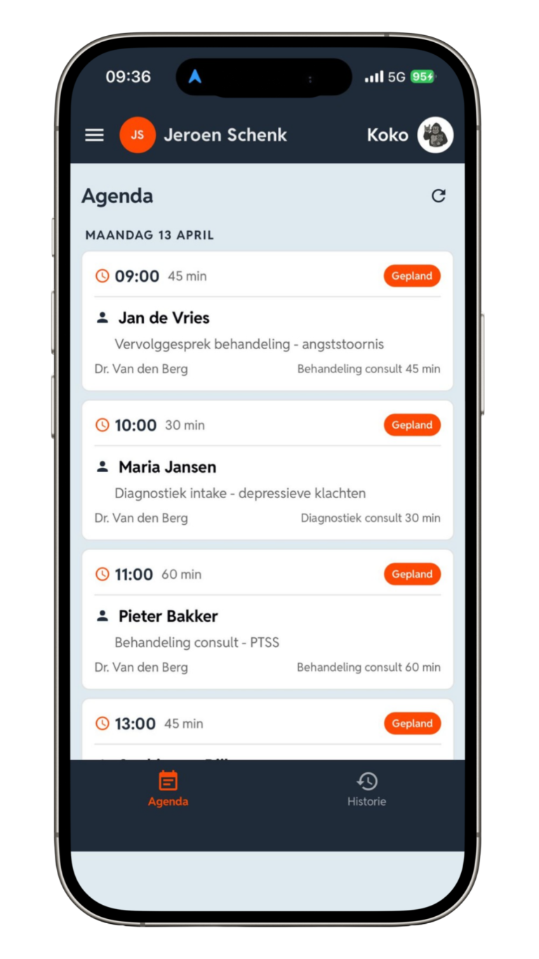 Tijdens een consult wil je als behandelaar niet half in het gesprek zitten en half in je hoofd al bezig zijn met de rapportage achteraf. Koko Voice haalt die druk weg. Je start de opname vanuit de afspraak die al voor je klaarstaat, voert het gesprek zoals je gewend bent en laat de uitwerking daarna automatisch verlopen dankzij geavanceerde AI-oplossingen.