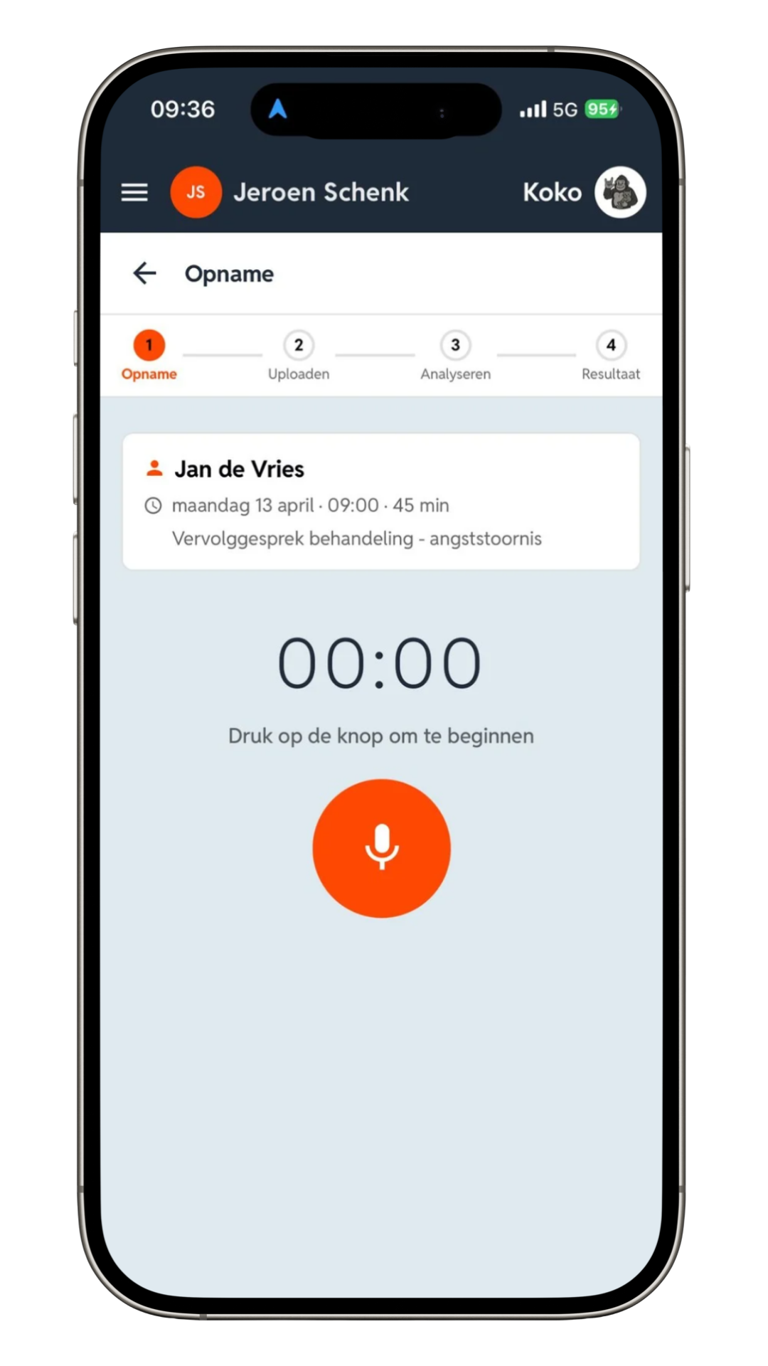 Je logt in via Single Sign-On, ziet direct je afspraken van vandaag en opent simpelweg de afspraak die je wilt vastleggen. Met één druk op de knop start de opname tot wel een uur lang. Na afloop zet Koko Voice de opname automatisch om in bruikbare output voor dossiervoering en opvolging.