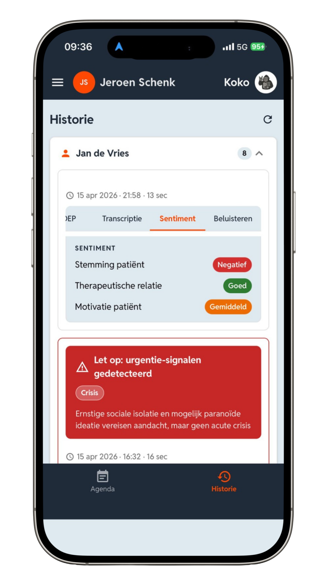 Koko Voice helpt je om risicosignalen eerder te herkennen en geeft extra context met sentimentanalyse. Zo zie je niet alleen wat iemand zegt, maar krijg je ook meer zicht op signalen rond stemming, motivatie en behandelrelatie.